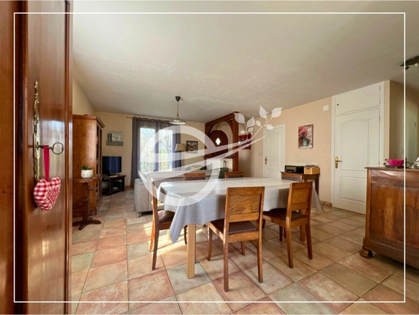 Maison d'environ 90 m2 habitables, comprenant un salon / séjour avec accès direct à une terrasse d'environ 50 m2, ainsi qu'une cuisine aménagée et équipée. La partie nuit se compose de 3 chambres, dont une en sous-sol. Le bien dispose d'un garage en sous-sol avec accès direct à la maison, ainsi que d'un second garage indépendant en fond de parcelle. L'ensemble est implanté sur un terrain d'environ 1 900 m2, sans vis-à-vis et sans mitoyenneté. Environnement de campagne calme, avec une vue dégagée et peu de nuisances sonores. Le terrain permet une utilisation extérieure sans contrainte de voisinage. Points remarquables :